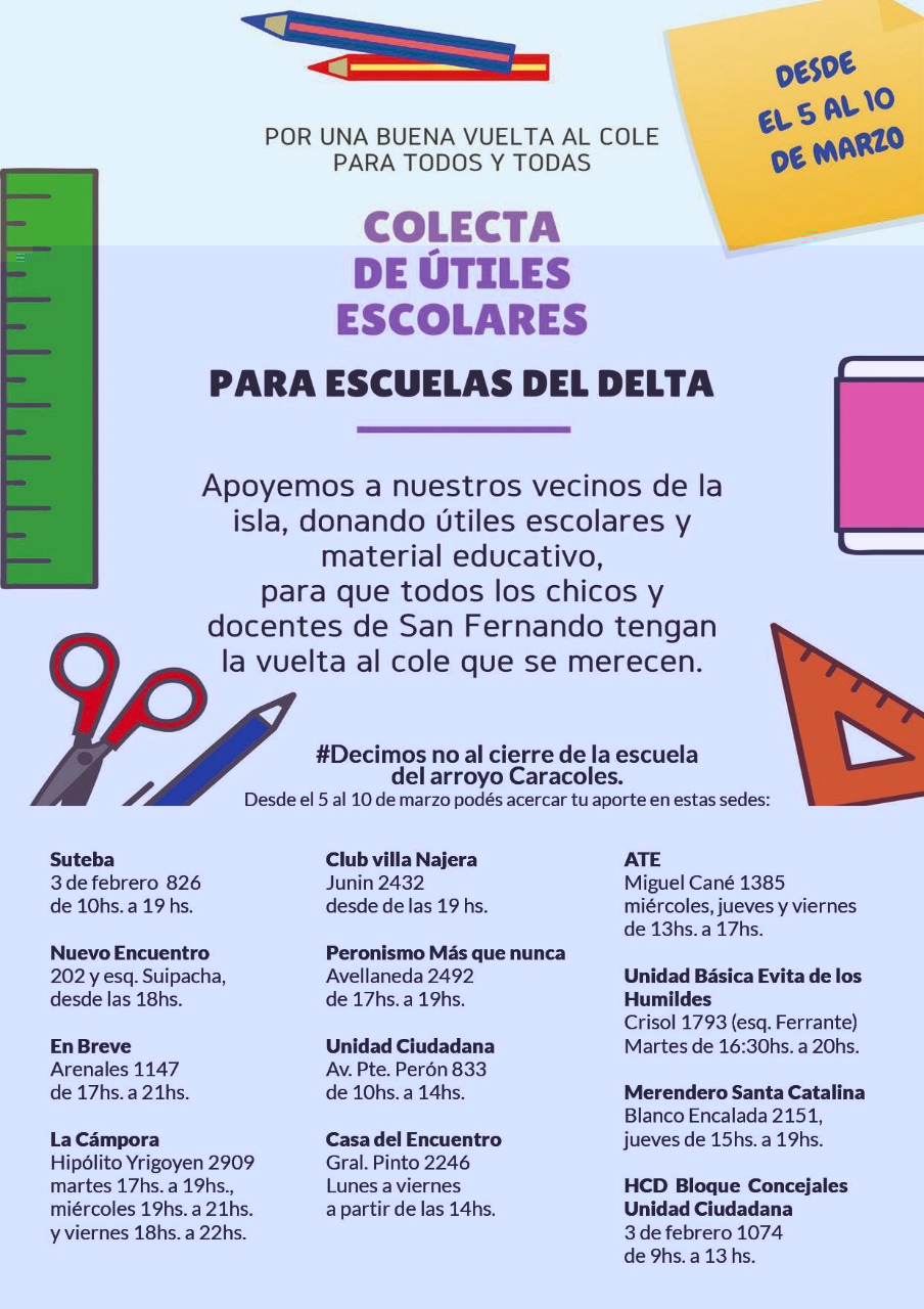 En vísperas del inicio el ciclo lectivo 2018, y en medio del conflicto por el riesgo de clausura de ocho establecimientos educativos del Delta de San Fernando, se lanzará una campaña solidaria para recolectar útiles escolares y material educativo para los chicos y chicas de islas. Bajo la consigna “Por una buena vuelta al cole para todos y todas”, se recibirán donaciones desde el 5 al 10 de marzo en distintos puntos del distrito.