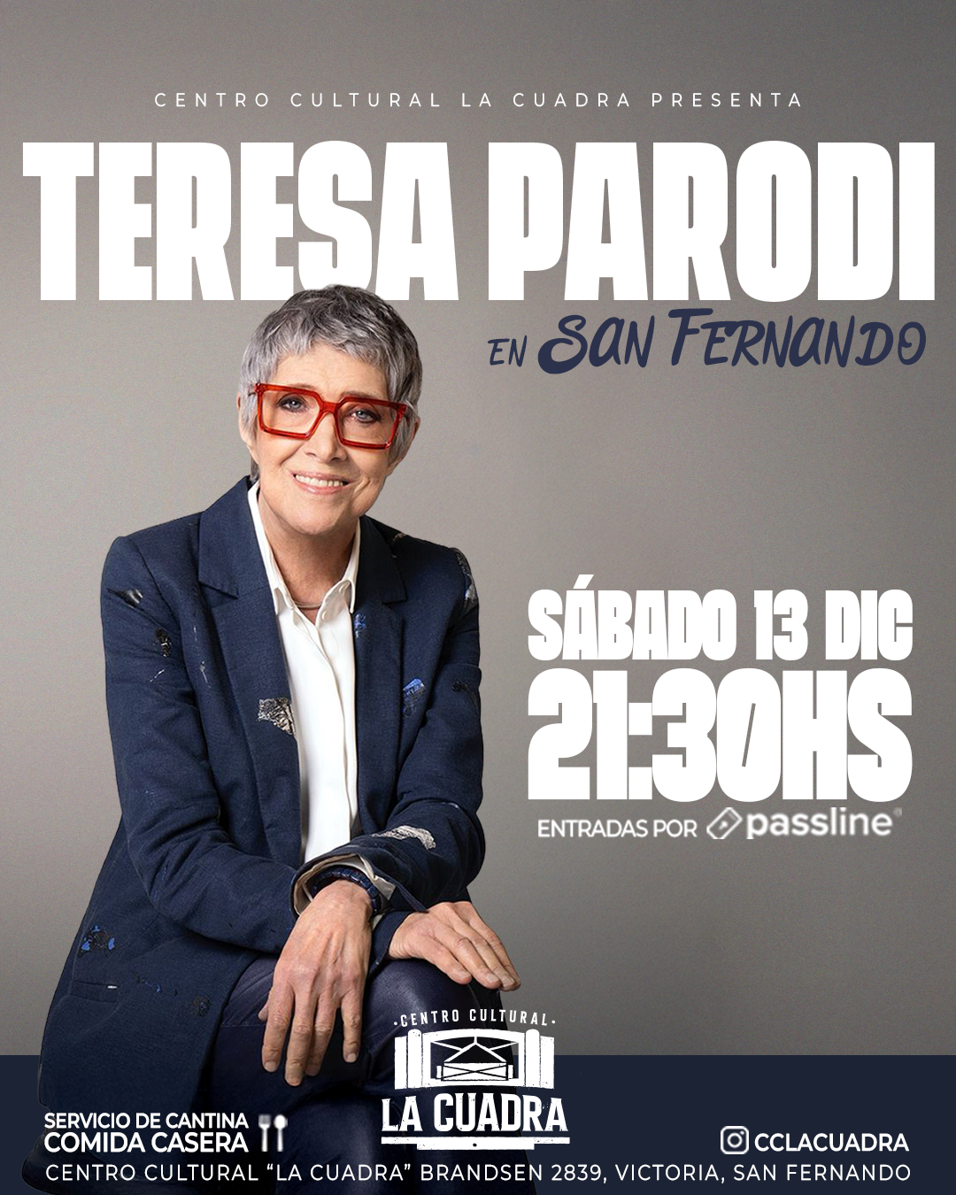 El Centro Cultural La Cuadra (Brandsen 2839, Victoria) abre sus puertas para recibir a un ícono de nuestro folklore: la gran Teresa Parodi. El show se realizará el sábado 13 de diciembre a partir de las 21.30h. Entradas a la venta aquí.