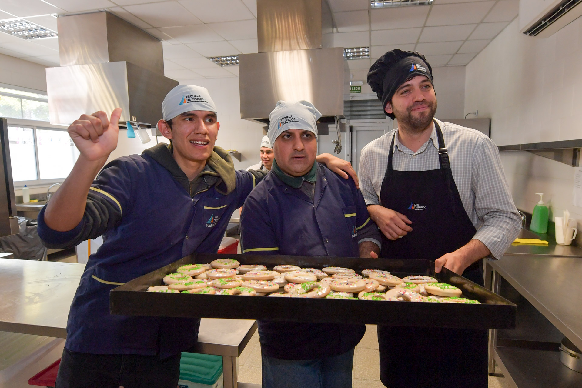 En esta oportunidad, los chicos que asisten al Taller Protegido realizaron una clase de cocina. “Los viernes estamos recibiendo la visita del Taller Protegido, vienen a aprender algunas recetas, disfrutamos mucho, la pasamos bien. Hoy hicimos donas, por lo general trabajamos con panificados y pastelería. Se hace muy amena la mañana de los viernes en la Escuela”, explicó el coordinador de las Escuela de Oficios Municipal, Luis Cacciatore.