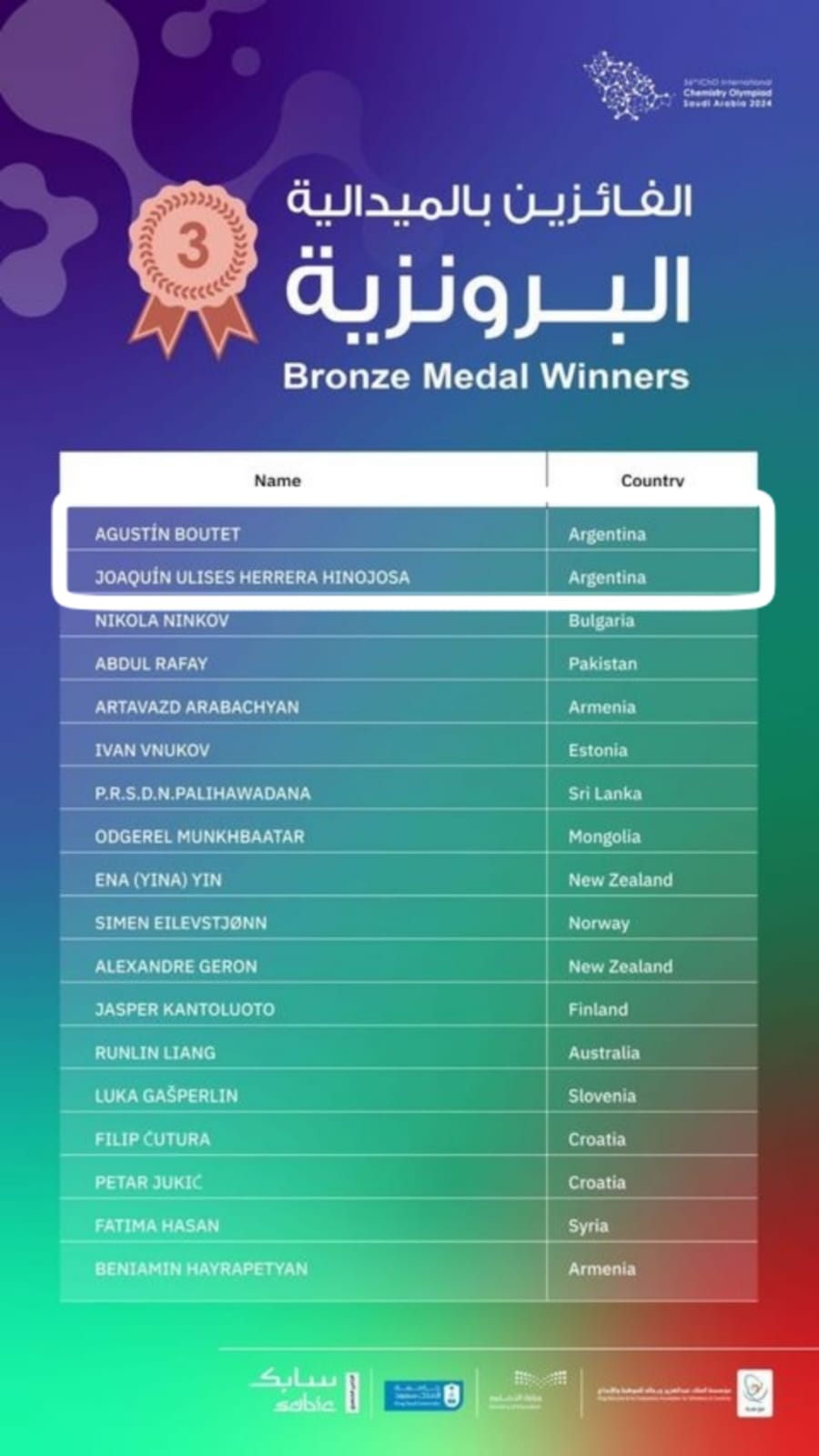 Las Olimpiadas de Química que comenzaron el 21 y finalizan hoy en Arabia Saudita deja dos medallas de bronce y una mención de honor para el equipo argentino. Entre los que obtuvieron preseas se encuentra Joaquín Herrera, el sanfernandino del barrio Infico.