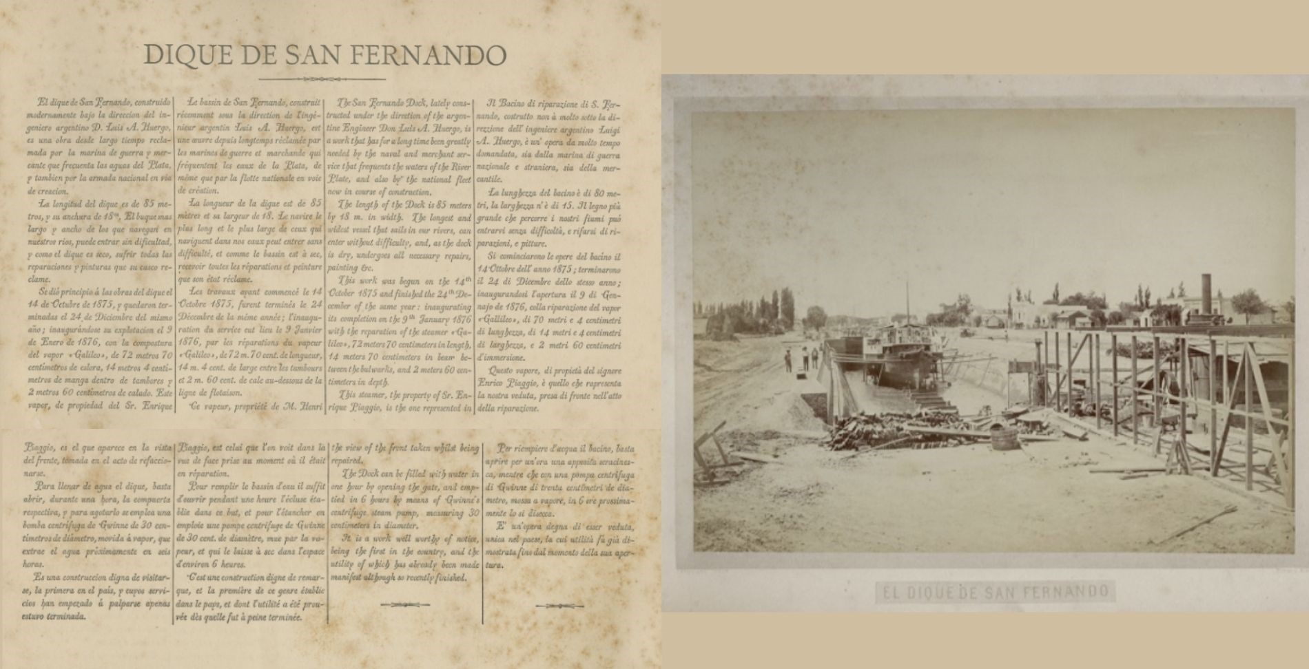 “El dique de San Fernando, construido modernamente bajo la dirección del ingeniero argentino Luis A. Huergo, es una obra desde largo tiempo reclamada por la marina de guerra y mercante que frecuenta las aguas del Plata, y también por la armada nacional en vía de creación”, establece la imagen del fotógrafo Christiano Junior tomada en 1876.