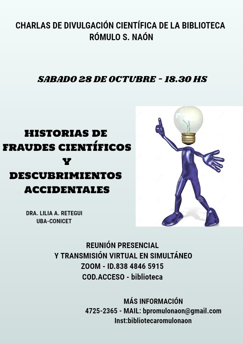 Este próximo sábado 28 de octubre en la Biblioteca Popular Rómulo Naón a partir de las 18:30 hs se llevará a cabo el encuentro “Historias de fraudes científicos y descubrimientos accidentales”.