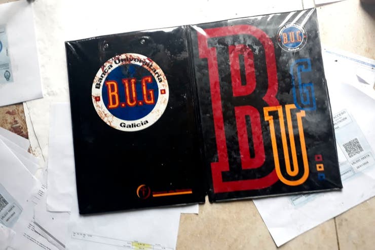 De color negro con letras a colores, la carpeta llevaba la leyenda “B.U.G.” de “Banca Universitaria Galicia”. En su interior, había muestras de papel símil moneda, con impresiones de billetes de 100 dólares falsificados.