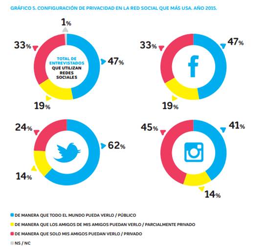 Las redes sociales constituyen un canal de comunicación y expresión. Facebook es la más extendida: el 95% de los encuestados abrió al menos un perfil y aunque dice usarla poco, no piensa abandonarla. Su crecimiento intergeneracional es un problema para los jóvenes, que prefieren canales de contacto con sus pares que excluyan a familiares mayores. En segundo y tercer lugar los encuestados mencionaron Twitter e Instagram y como principal vía de comunicación, WhatsApp. Las redes sociales no sólo se utilizan para contactarse con amigos: el 51% de adolescentes se informa en Facebook y Twitter.