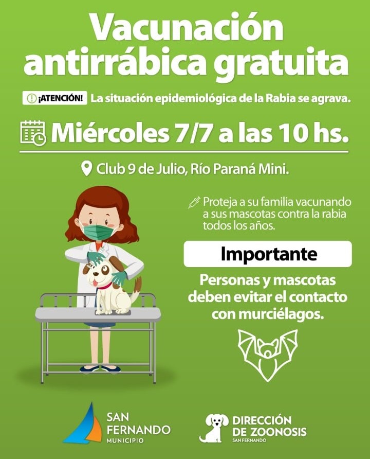 Con el interés de reforzar la cobertura de la vacunación antirrábica en el sector insular, el miércoles 7 de julio el área de Zoonosis estará desarrollando un operativo de vacunación y desparasitación en el Club de 9 Julio ubicado a orillas del Río Paraná Miní.