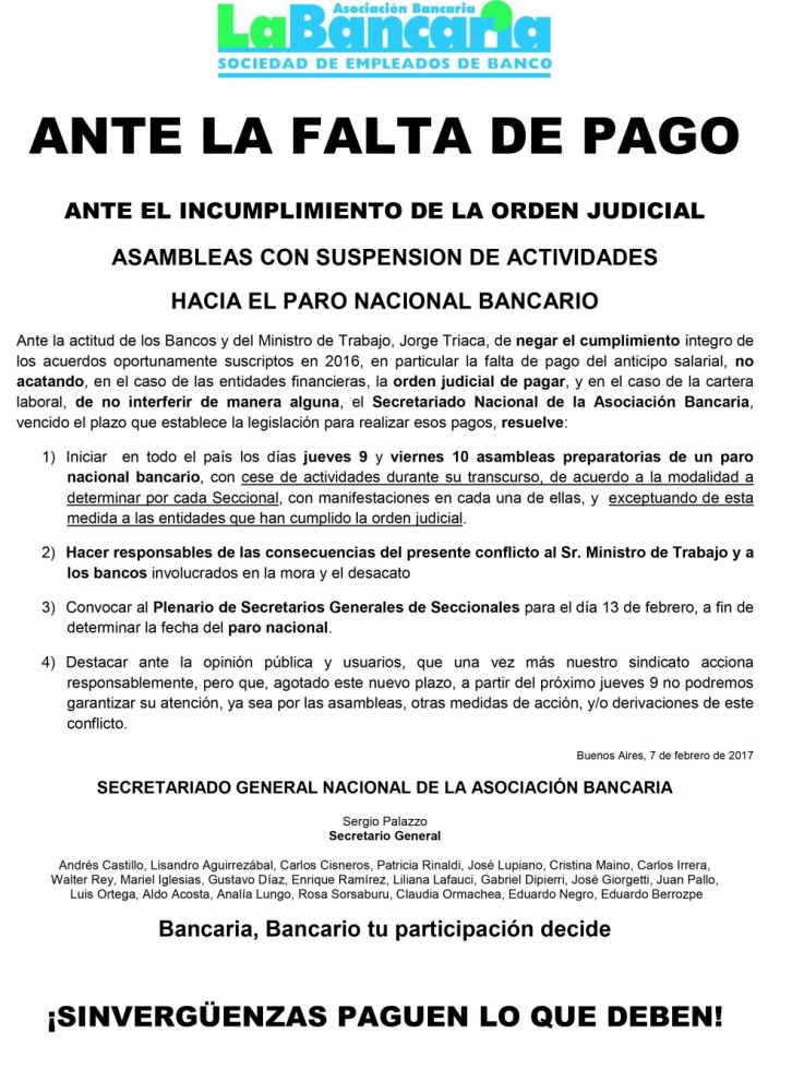 En un comunicado firmado por los secretarios general, Sergio Palazzo, y de Prensa, Eduardo Berrozpe, en representación del secretariado del gremio, la bancaria explicó los trabajadores del sector realizarán “asambleas preparatorias de un gran paro nacional” del sector, que se aplicará “con cese de actividades y de acuerdo con la modalidad a determinar por cada seccional”.