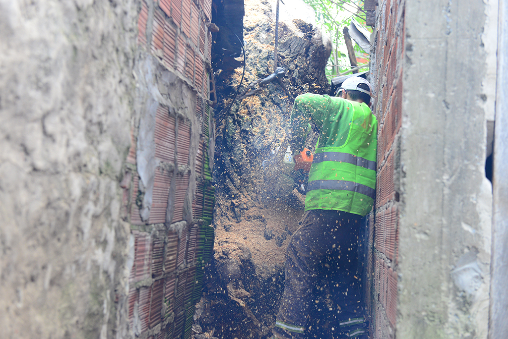 Rosa, una de las vecinas afectadas, relató el suceso: “Apenas llamé vinieron de Defensa Civil, de Espacios Públicos, de Asistencia Social y todo lo que hacía falta. El árbol me rompió toda la pared y el techo, pero apenas llamé, me brindaron auxilio, les agradezco mucho. Ahora van a sacar el árbol de mi vecino que también parece peligroso, por lo que estoy agradecida del servicio”.