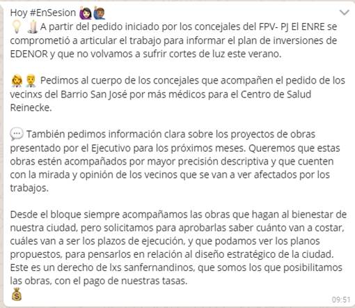 Volviendo al mensaje original que motivó esta nota, el concejal Alvarez explicó: “La reunión mantenida con el ENRE desde el oficialismo solicitaron la extensión de la red energética en la 3era sección de isla; desde el organismo solicitaron que frente a un corte además de realizar el reclamo a Edenor dejemos constancia en el ENRE para que pueda fiscalizar; conversamos sobre la falta de planificación de la empresa al momento del corte ya que cuando llamás para reclamar te brindan un tiempo posible de solución y muchas veces se excede o te regresan la luz y al otro día te la vuelven a cortar; el compromiso de garantizar la energía eléctrica a los 60 electrodependientes que posee el distrito”. Al mismo tiempo agregó que el organismo informó que en San Fernando ya hay 98 medidores con tarjeta.