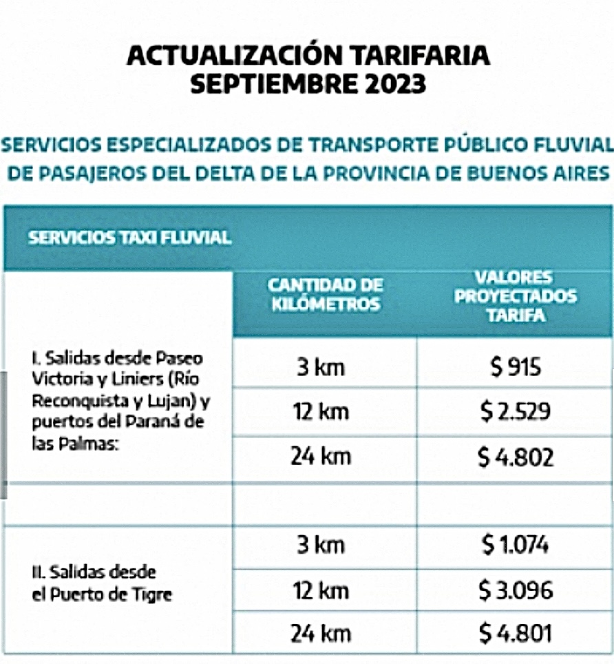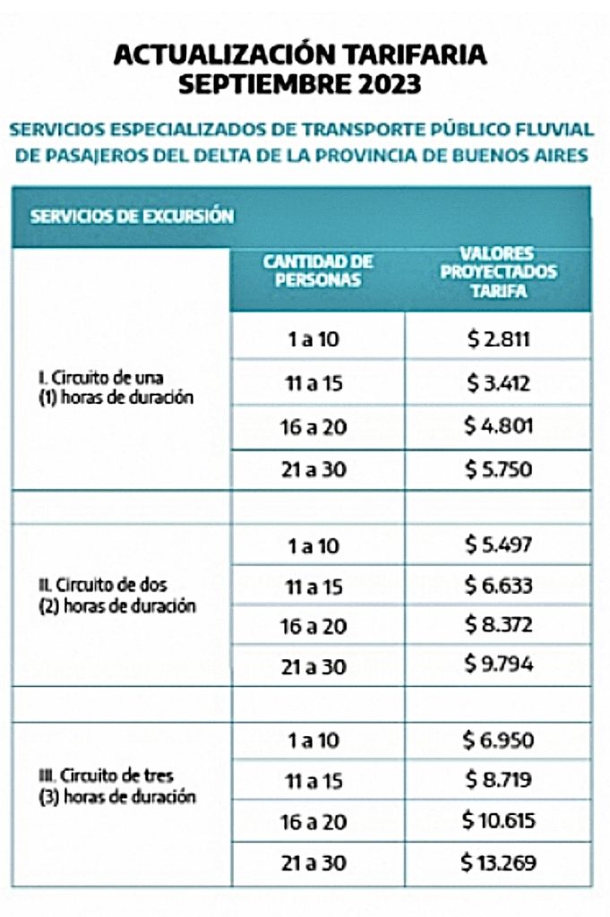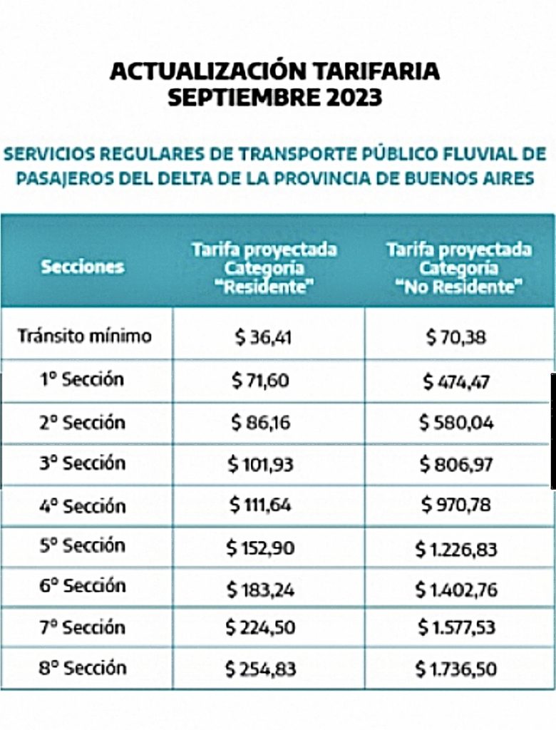 El Ministerio de Transporte de la Provincia de Buenos Aires puso en conocimiento público los cuadros tarifarios actualizados del transporte público fluvial de pasajeros del Delta bonaerense que regirán a partir de septiembre.