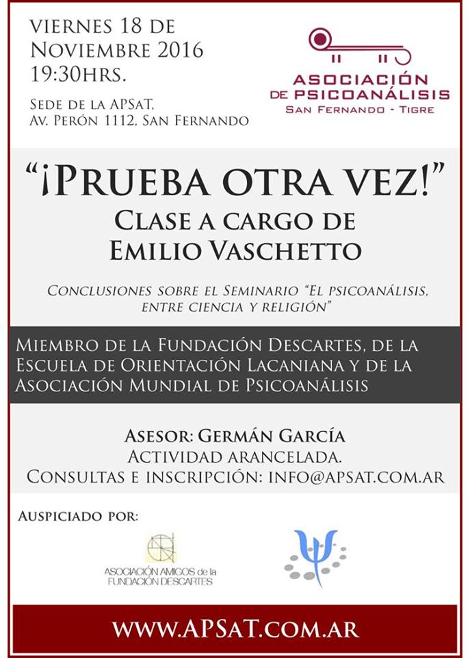 La Asociación de Psicoanálisis San Fernando-Tigre (APSaT) organizó una clase a cargo de Emilio Vaschetto sobre las conclusiones del seminario “El psicoanálisis entre ciencia y religión “. La actividad es arancelada y se llevará a cabo mañana a las 19:30 horas en la APSaT (Av. Presidente Perón 1112, San Fernando).