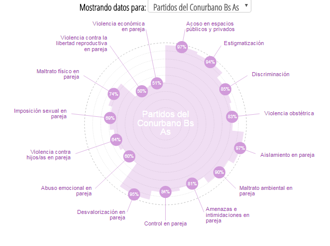 En Argentina Cuenta la Violencia Machista se midieron 15 dimensiones diferentes de violencia contra las mujeres. Ninguna de ellas se ubica por debajo del 47% de incidencia de, por lo menos, una situación experimentada. El valor más alto se registra en el acoso en espacios públicos y privados, la violencia cotidiana y más naturalizada: el 97% de las mujeres que respondieron el cuestionario experimentó al menos una vez alguna de estas situaciones.