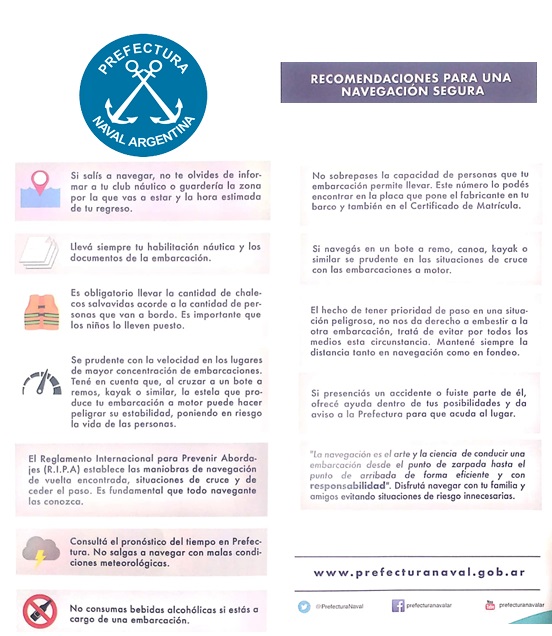 - Consultá el pronóstico del tiempo en Prefectura, no salgas a navegar con malas condiciones meteorológicas.