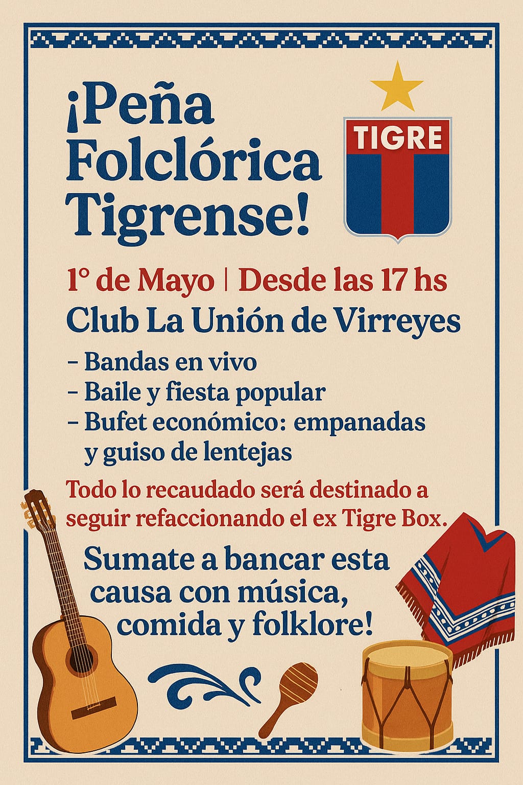 El 1° de Mayo, a partir de las 17, se llevará a cabo la ‘Peña Folclórica Tigrense’ en el Club La Unión (Av. Avellaneda 3262, Virreyes). Lo recaudado se utilizará para continuar con las reformas del ex Tigre Box.