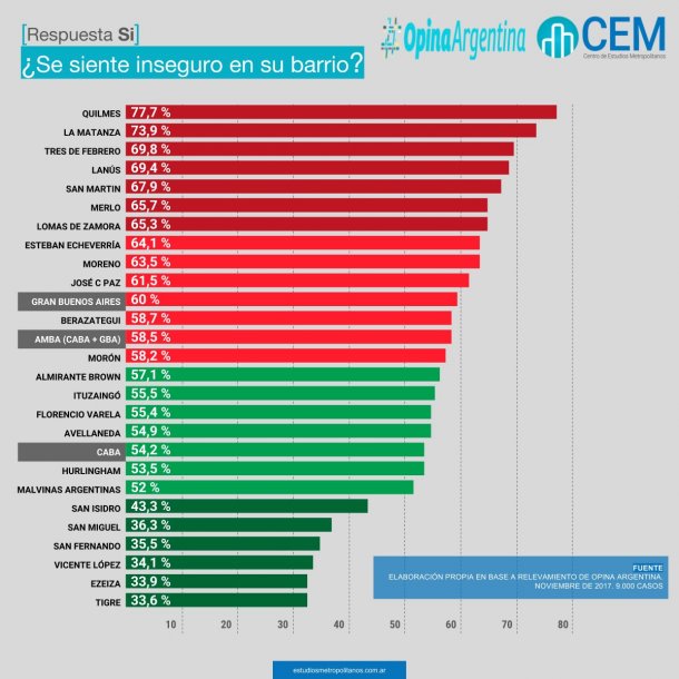 Entre los municipios con mayor preocupación por los niveles de inseguridad se encuentran Quilmes (78%), La Matanza (74%) y Tres de Febrero (70%). En el caso de la Ciudad de Buenos Aires, el 54% de su población se siente insegura, muy cerca del promedio del toda el Área Metropolitana (59%) y similar a otros municipios como Hurlingham, Avellaneda y Florencio Varela.