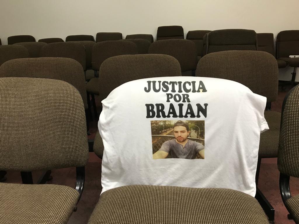 Braian FillipLa mamá de Braian, Loredana, acomoda minuciosamente una remera sobre el respaldo de una silla. La remera tiene la foto de la víctima con la inscripción “Justicia por Braian”. La silla está ubicada en la primera hilera, detrás se sienta el público.