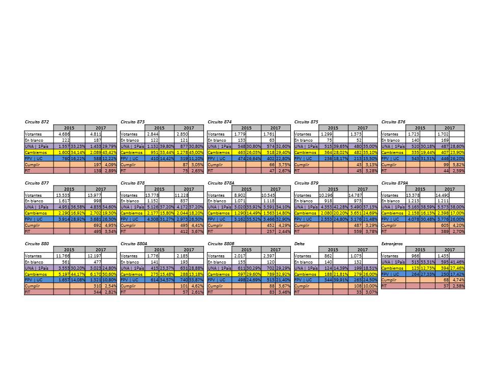 Por otro lado, si bien 1 País perdió votos en la mayoría de los circuitos, en el 879, 880 y 880A superó el 5% y en el 873 el 9%.