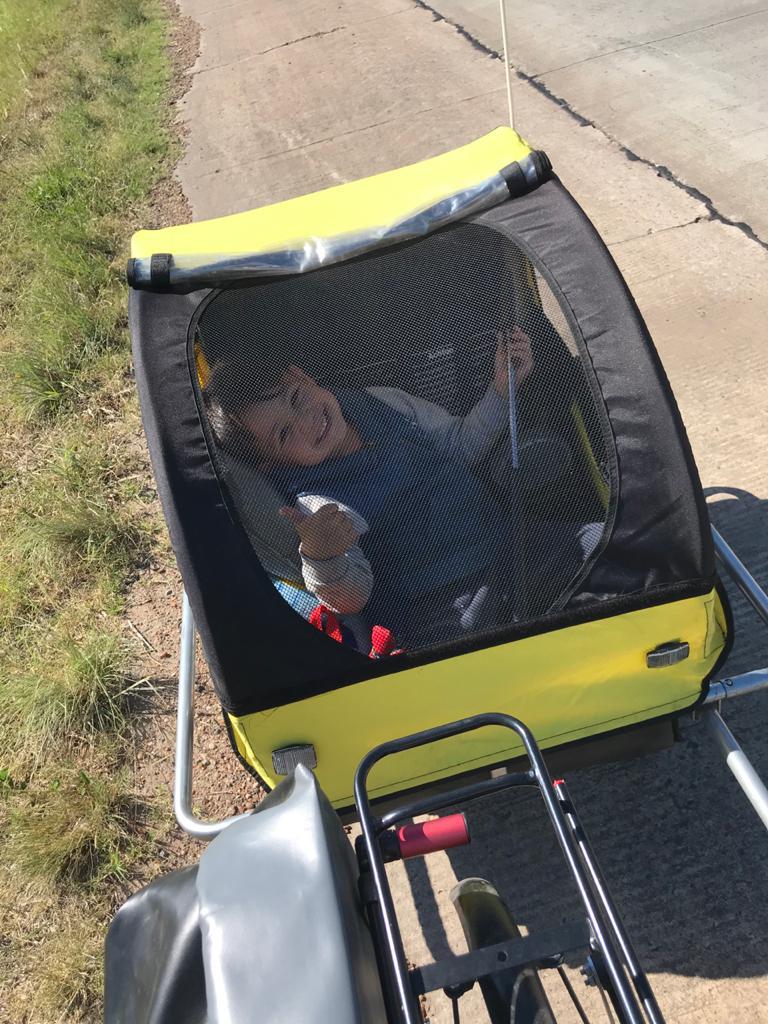 Le ambienté el carro con cosas de él: juguetes, oso, almohadita. Se sentía súper cómodo. Cuando terminábamos de pedalear y encontrábamos una plaza aprovechaba a jugar. Que el papá lo lleve en la bici, en su trailer le encantaba: dormía, jugaba, hablaba, cantaba. estaba súper tranquilo.
