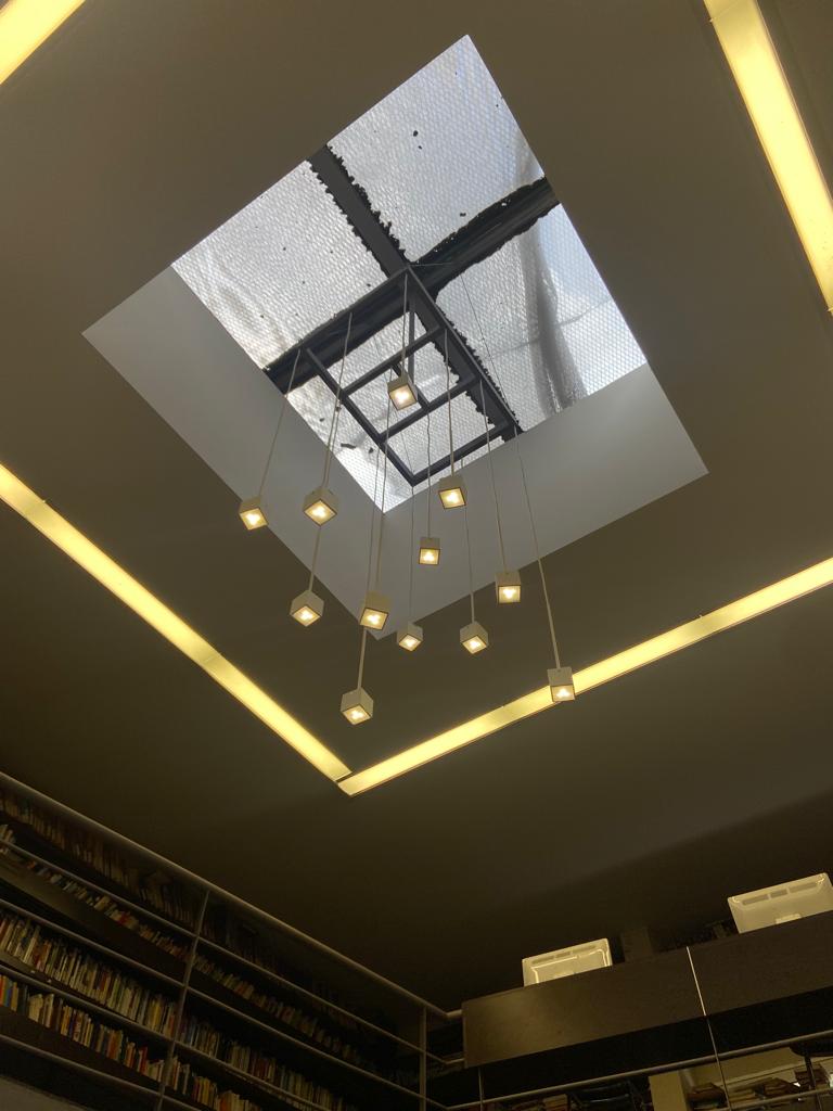 Por fuera se trata de un lugar pequeño, geométrico, de un blanco no tan blanco, poco llamativo. Por dentro dos pisos -un piso y un entrepiso, en realidad-, una mesa de vidrio con varias sillas, algunas computadoras, un rincón con goma evas pensado para los más chicos, una escalera gris. Y libros. Como su título de biblioteca anticipa, en este lugar si hay algo que importa son los libros.