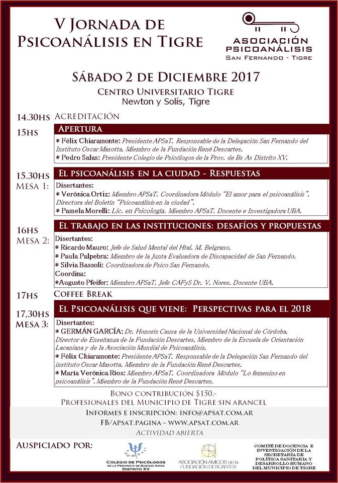 Como cada año, la Asociación Psicoanálisis San Fernando – Tigre (APSaT) organiza las Jornadas de Psicoanálisis. En esta oportunidad será llevada a cabo en el Centro Universitario Tigre (Newton y Solís), el próximo sábado 2 de diciembre de 14:30 a 19:00 horas.